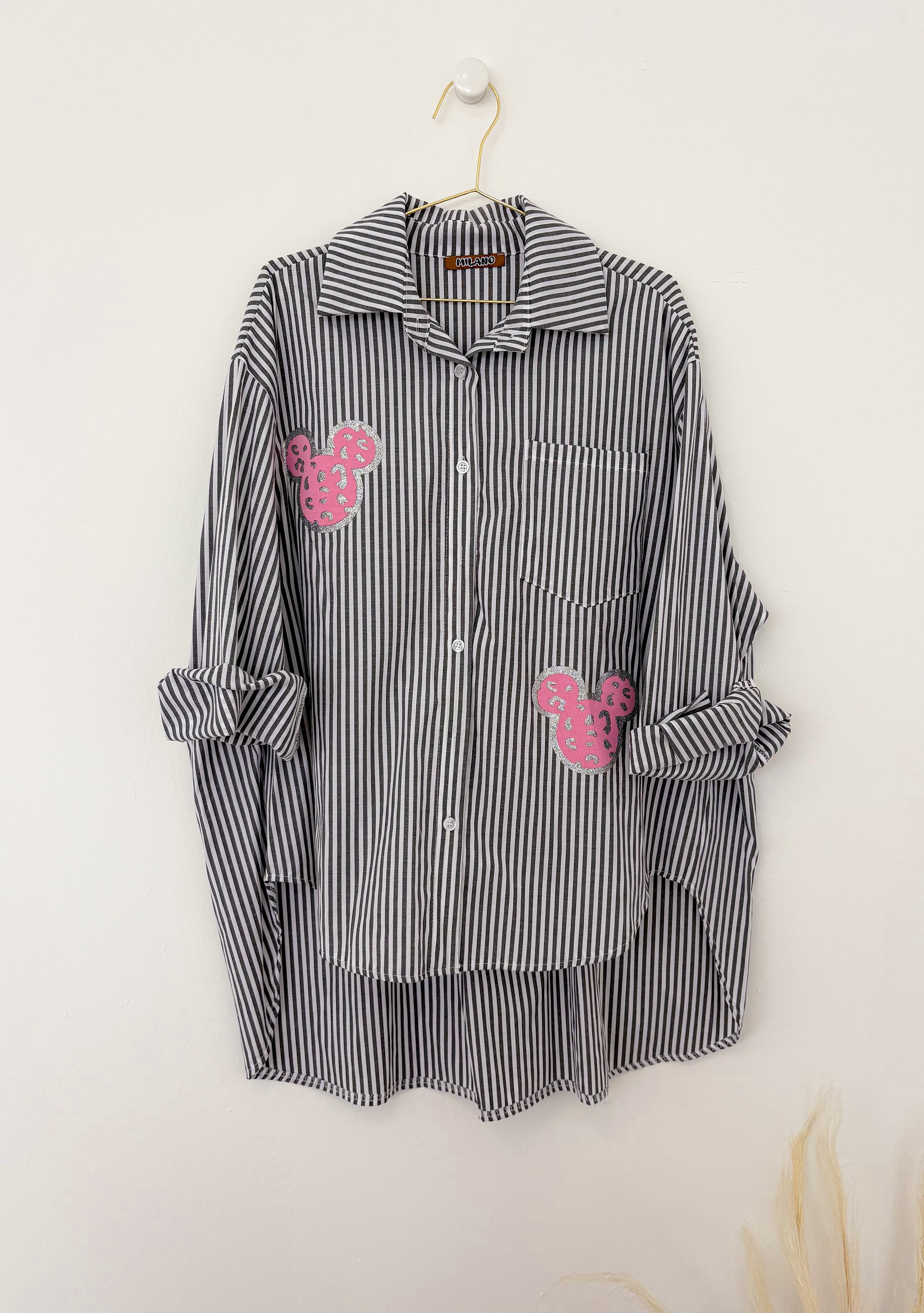 Preciosa camisa oversize de rayas con detalles en rosa. Es muy amplia. Tapa culete.