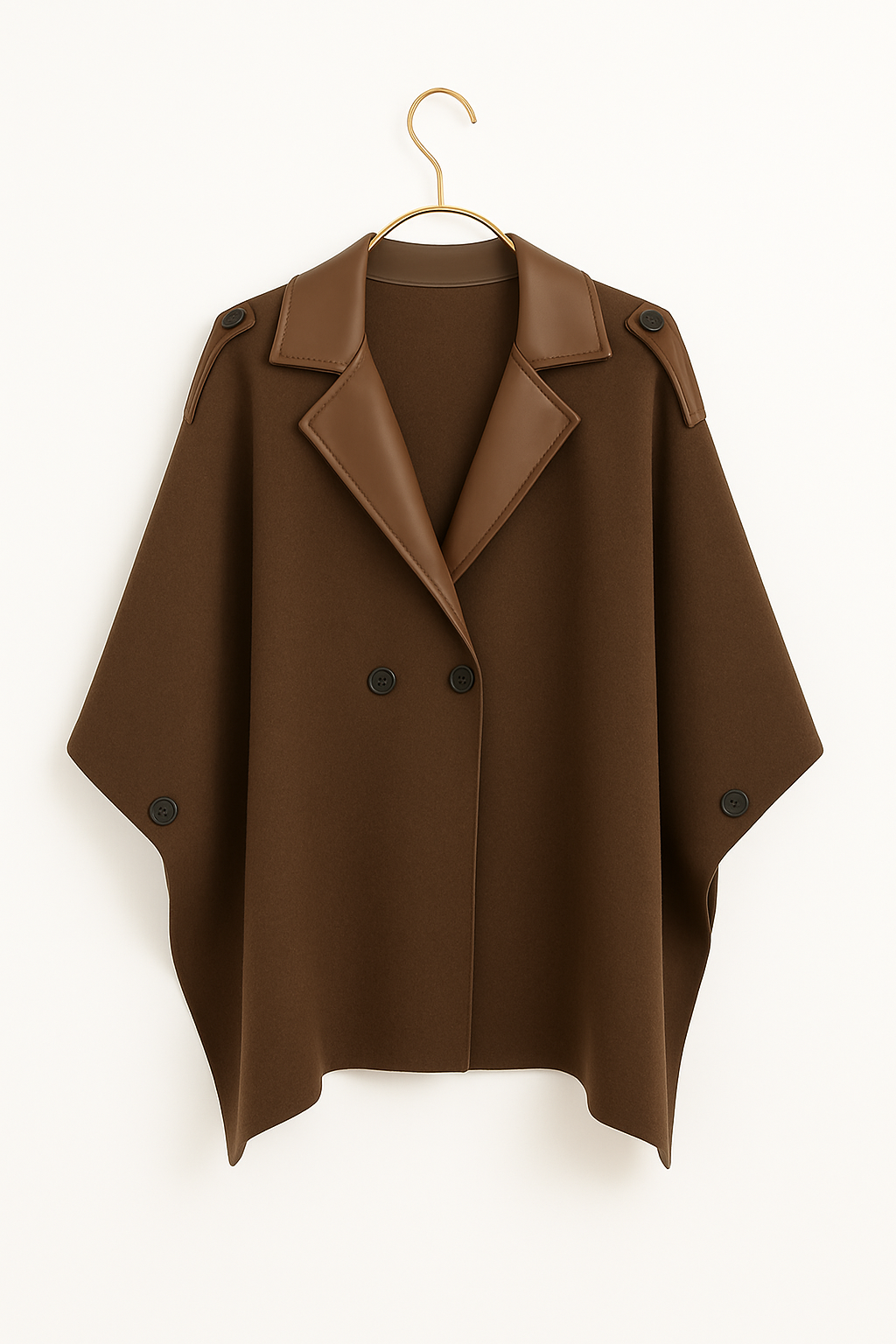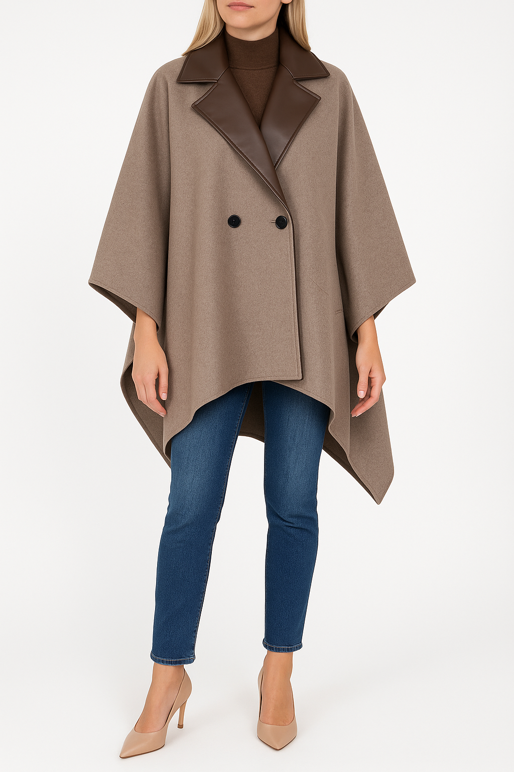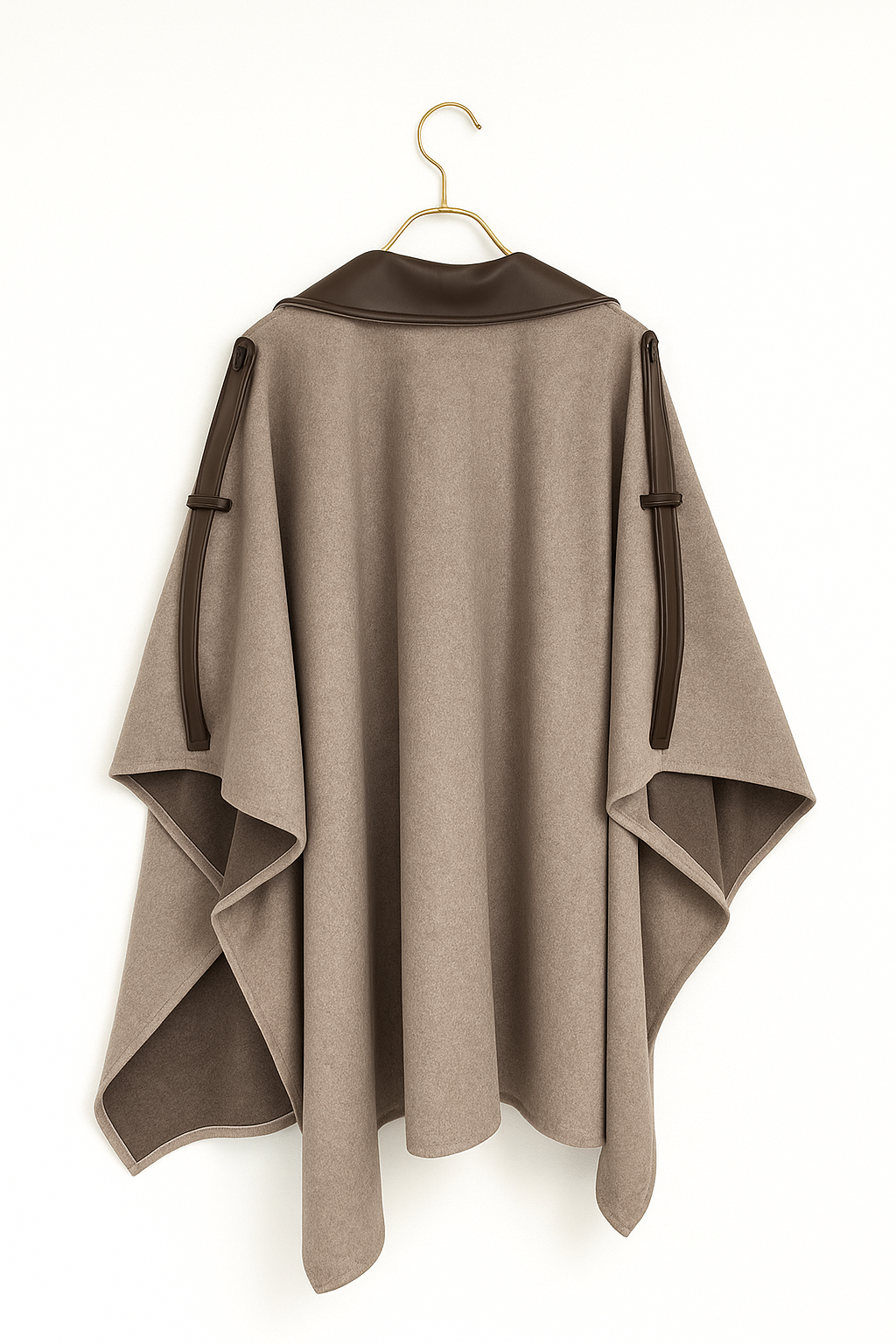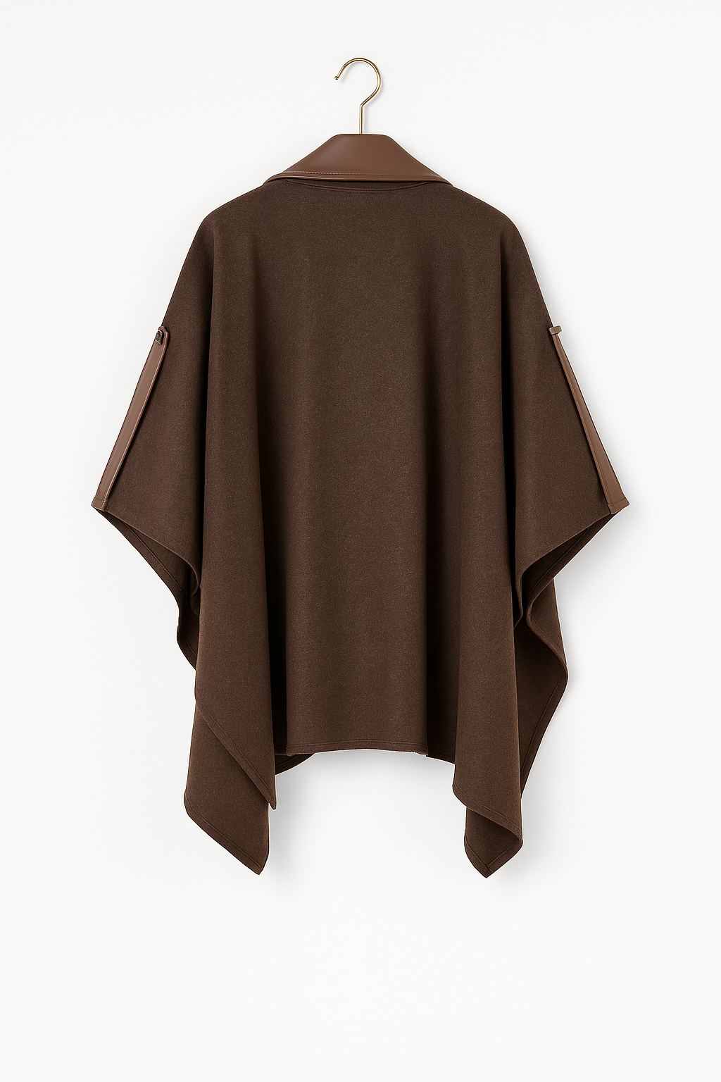 Preciosa capa en tejido calentito con detalles en polipiel. Prenda muy original. Sienta ideal y le da un toque sofisticado a tus looks.
