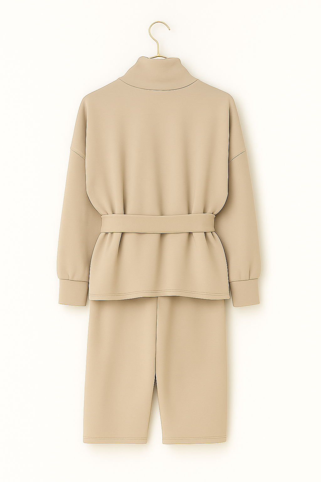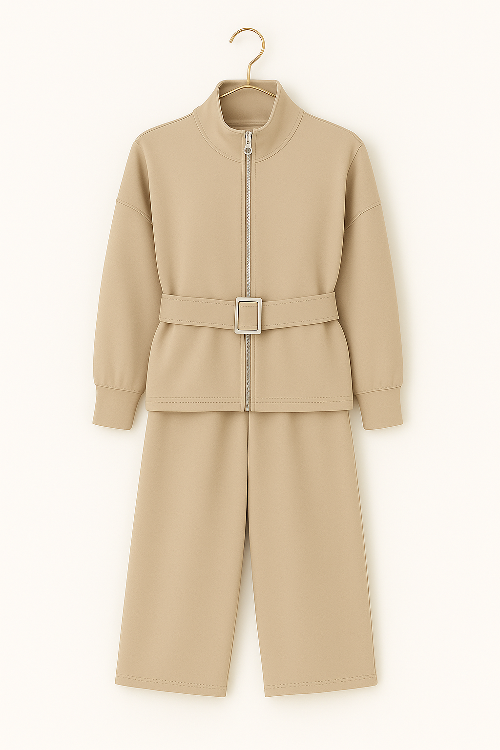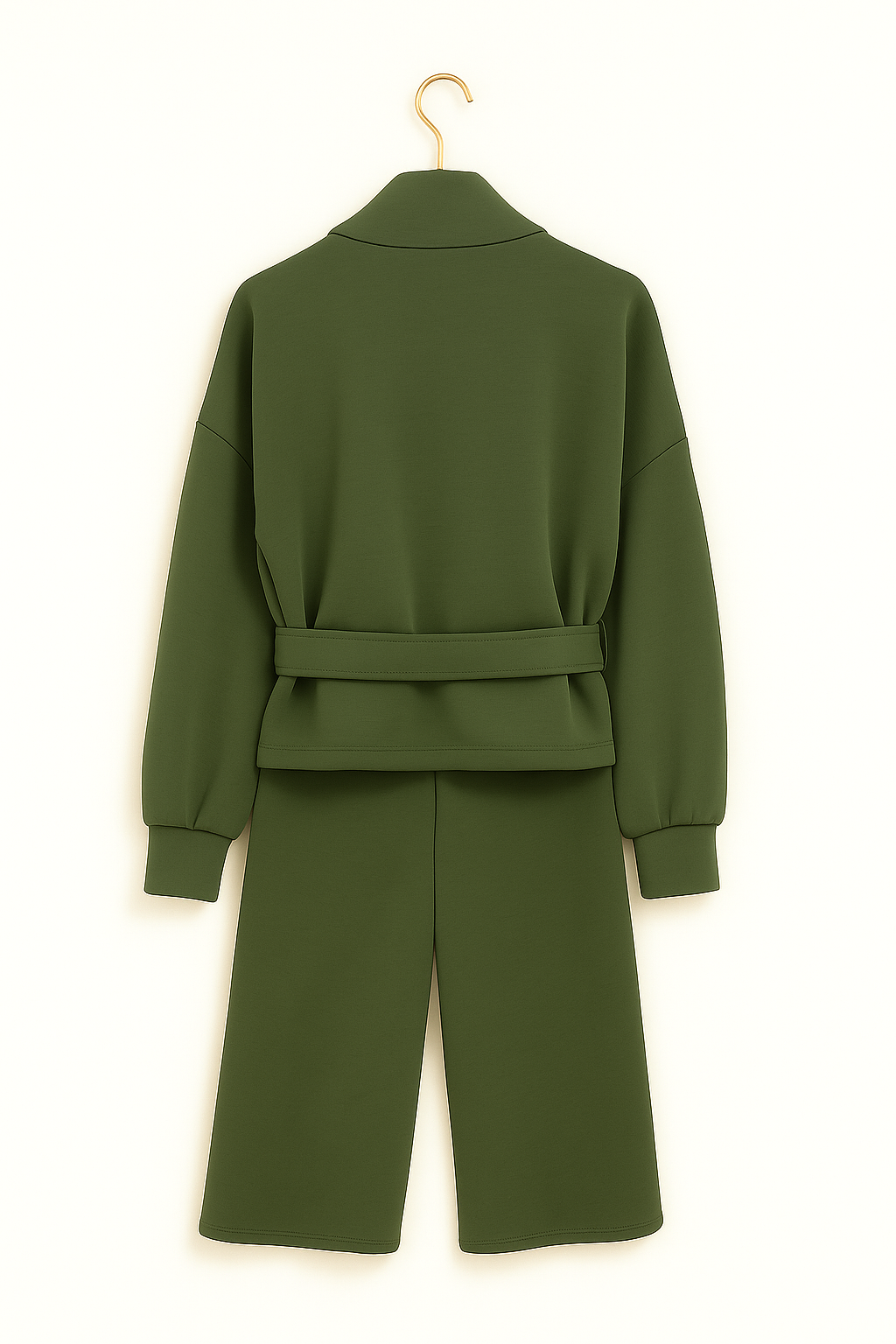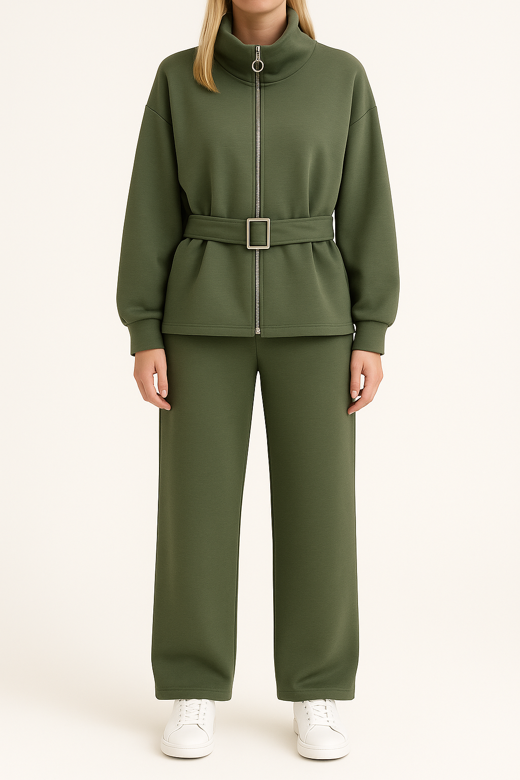 Precioso conjunto chandal en tejido neopreno al que no le salen pelotillas. Chaqueta con cremallera entallada y cinturón. Pantalón recto con cintura engomada.