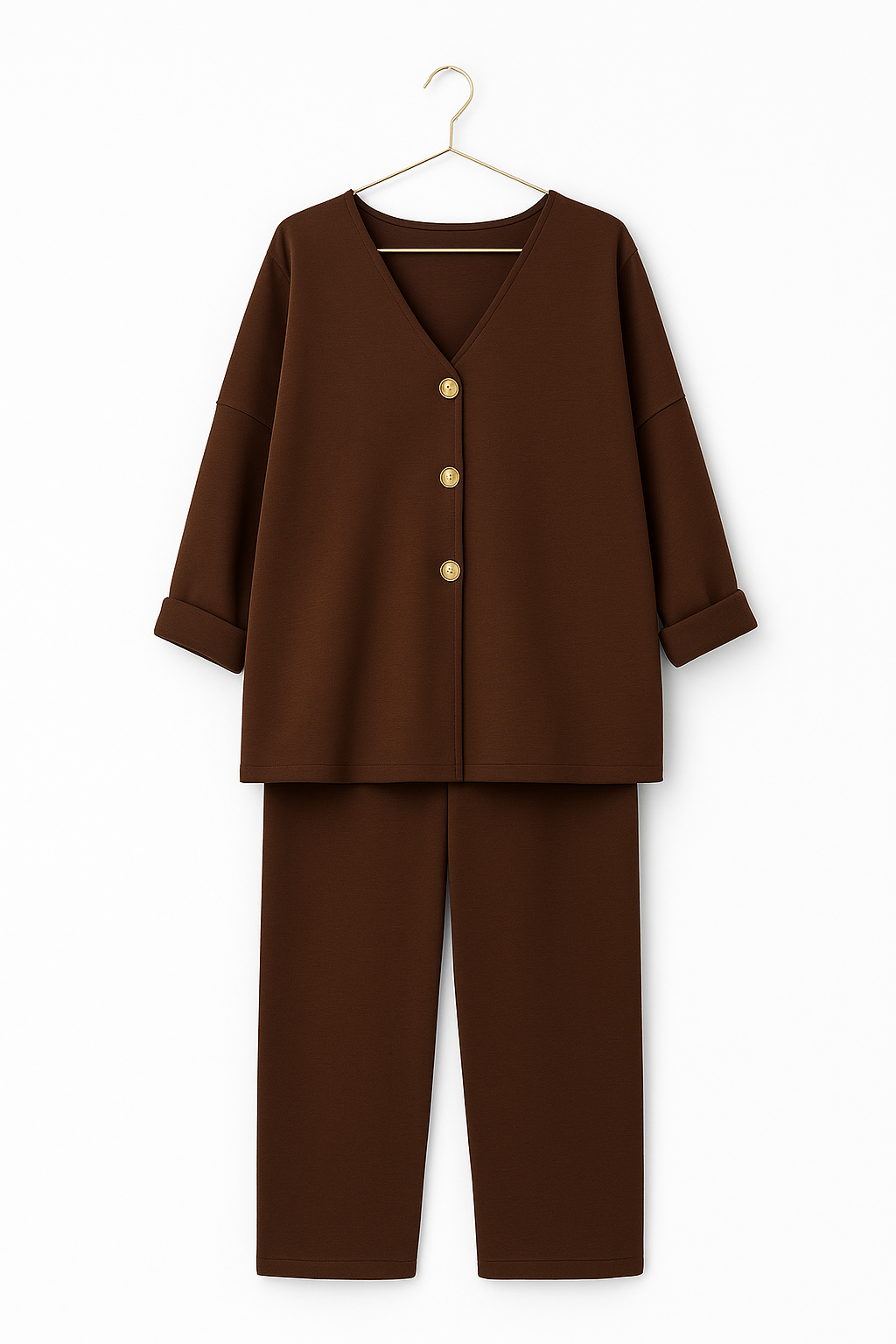 Contorno de pecho 130 cm. Largo del suéter 78 cm. Cintura elástica. Cadera 120 cm. Largo del pantalón 104 cm.