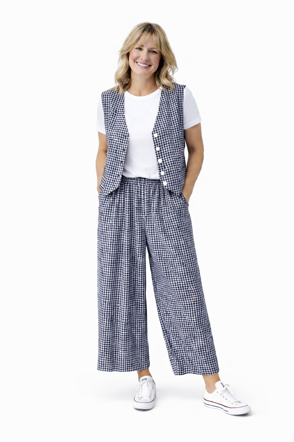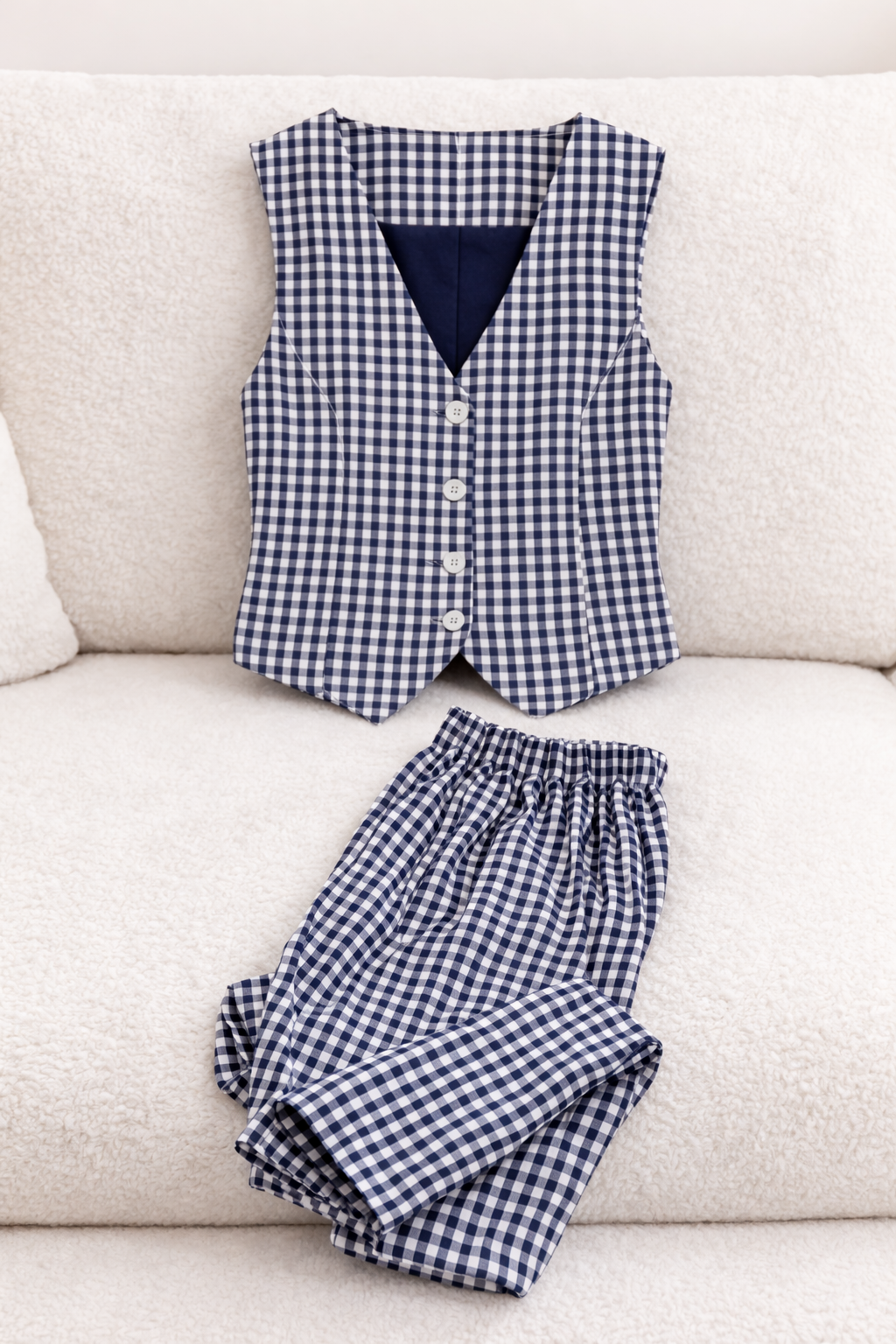 Precioso conjunto Vichy en algodón con tejido de calidad excelente. Chaleco tipo sastre y pantalón de pata ancha con goma en la cintura. Sienta genial.