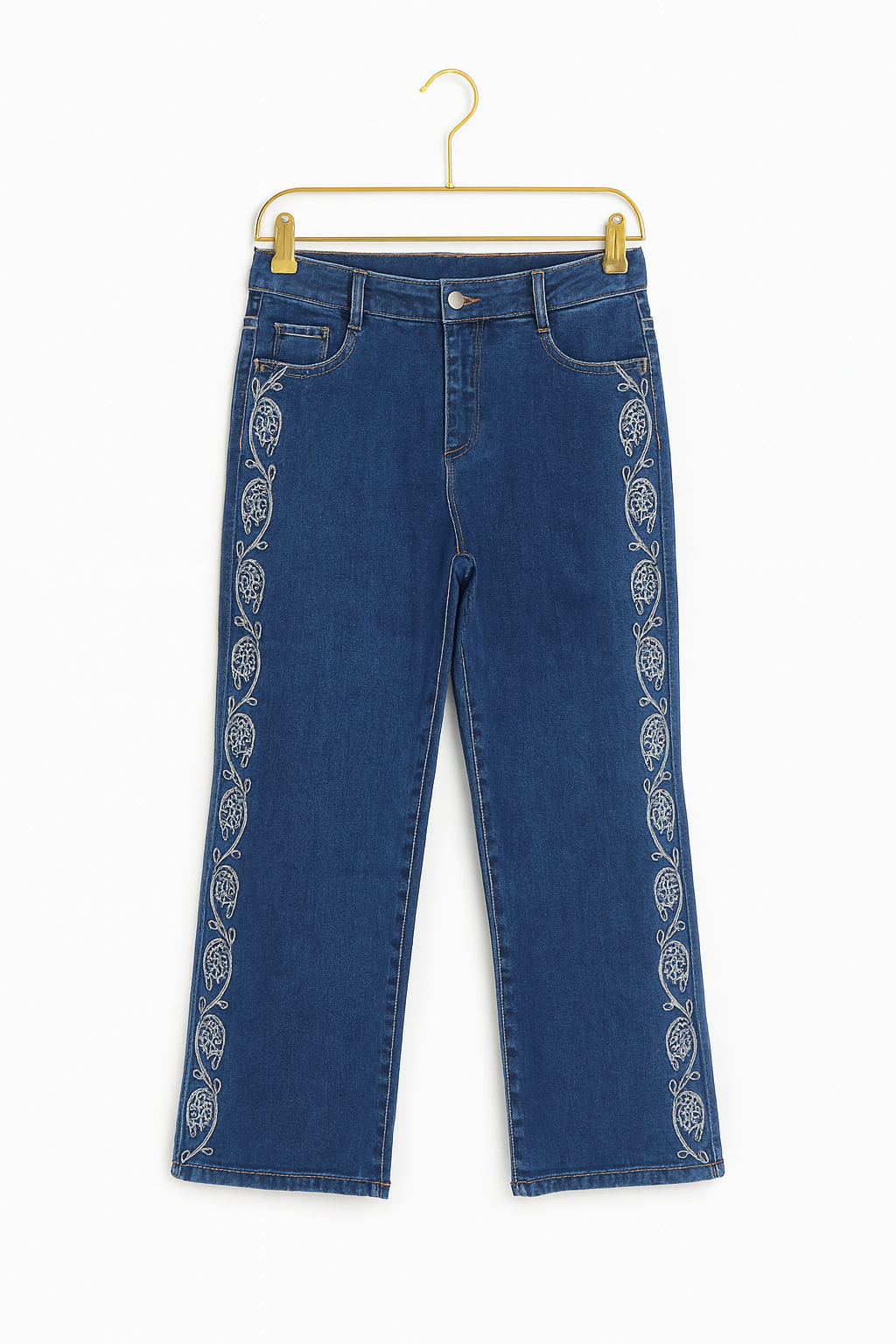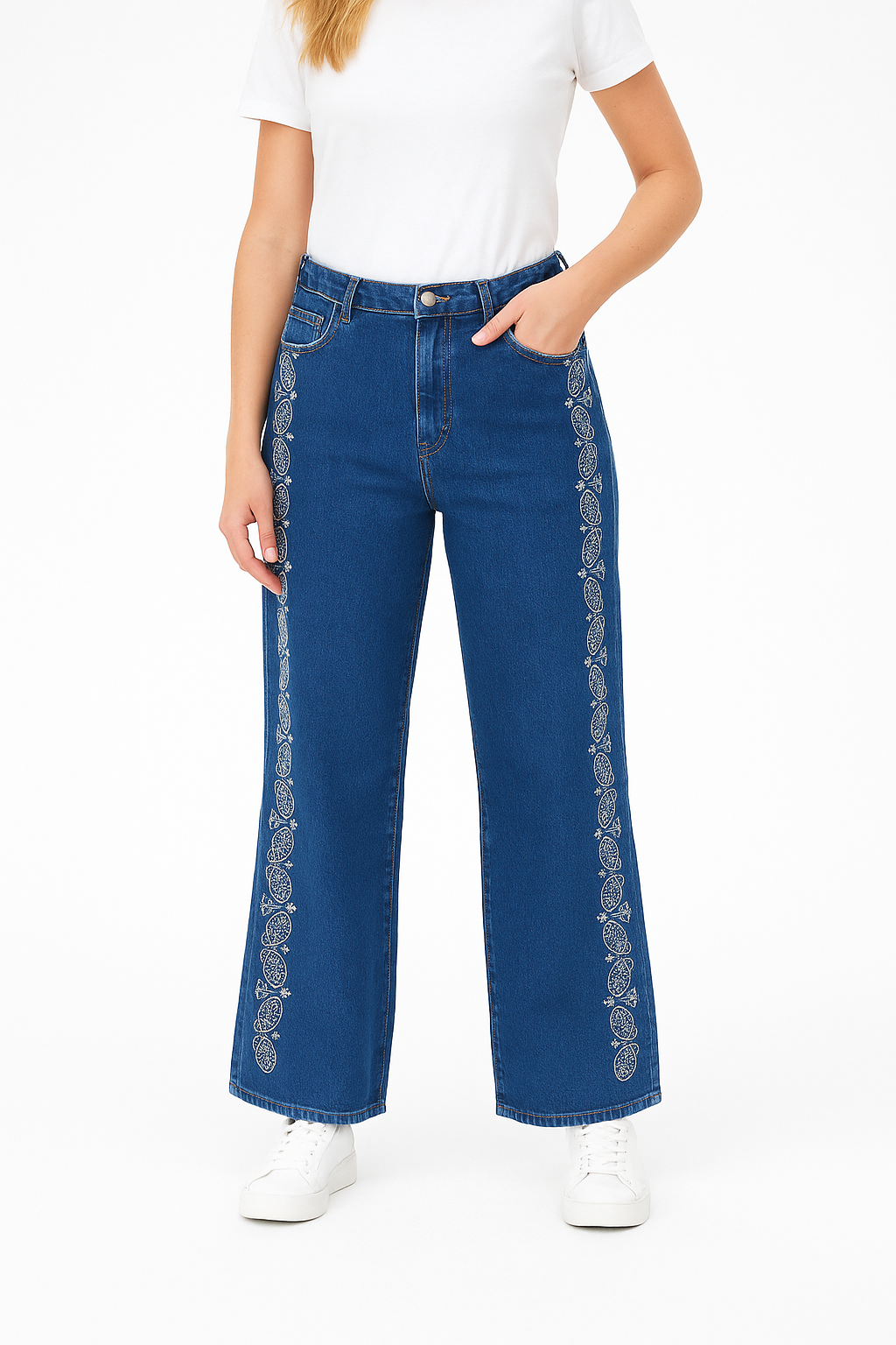 Preciosos jeans de pata ancha con bordado blanco en los laterales.