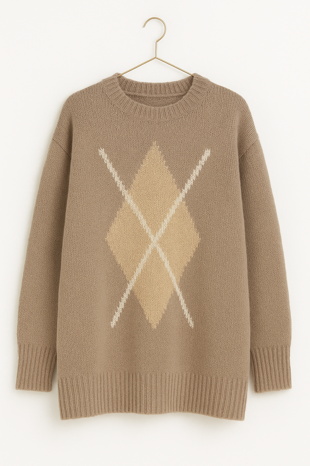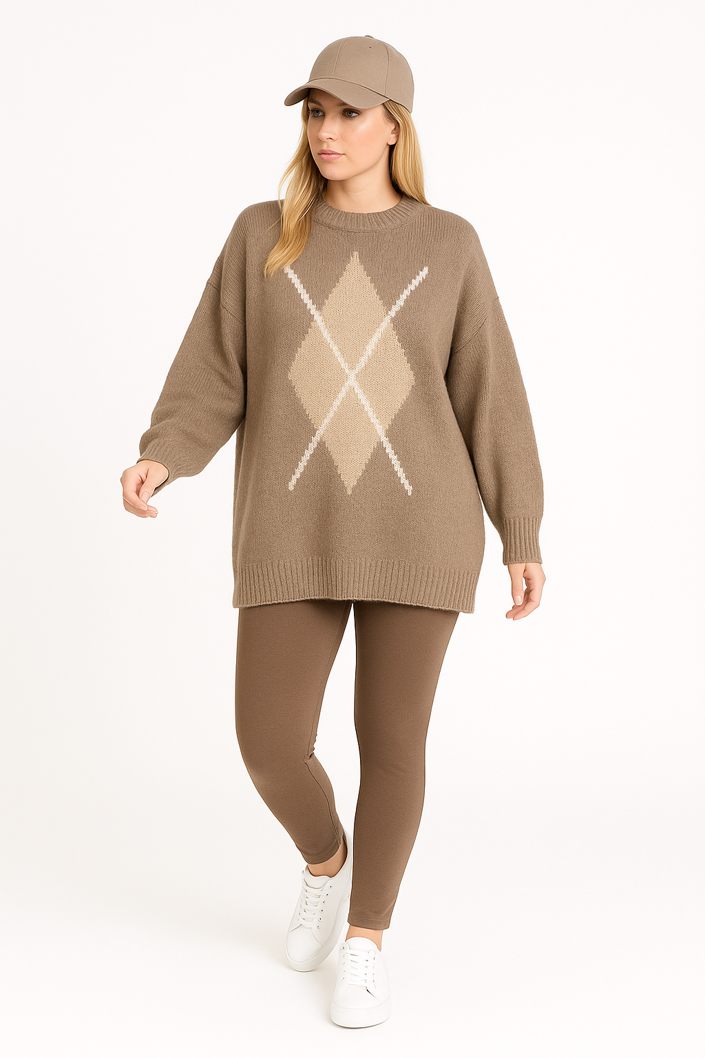 Precioso suéter largo y oversize de Mohair con estampado de rombo. Es muy suave, calentito y no pica.