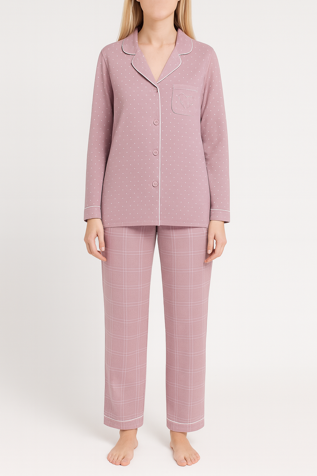 Precioso pijama de algodón, camisero y forrado de pelito por dentro. Pantalón engomado y elástico. Camisa oversize. Tonos pastel. Es muy cómodo.
