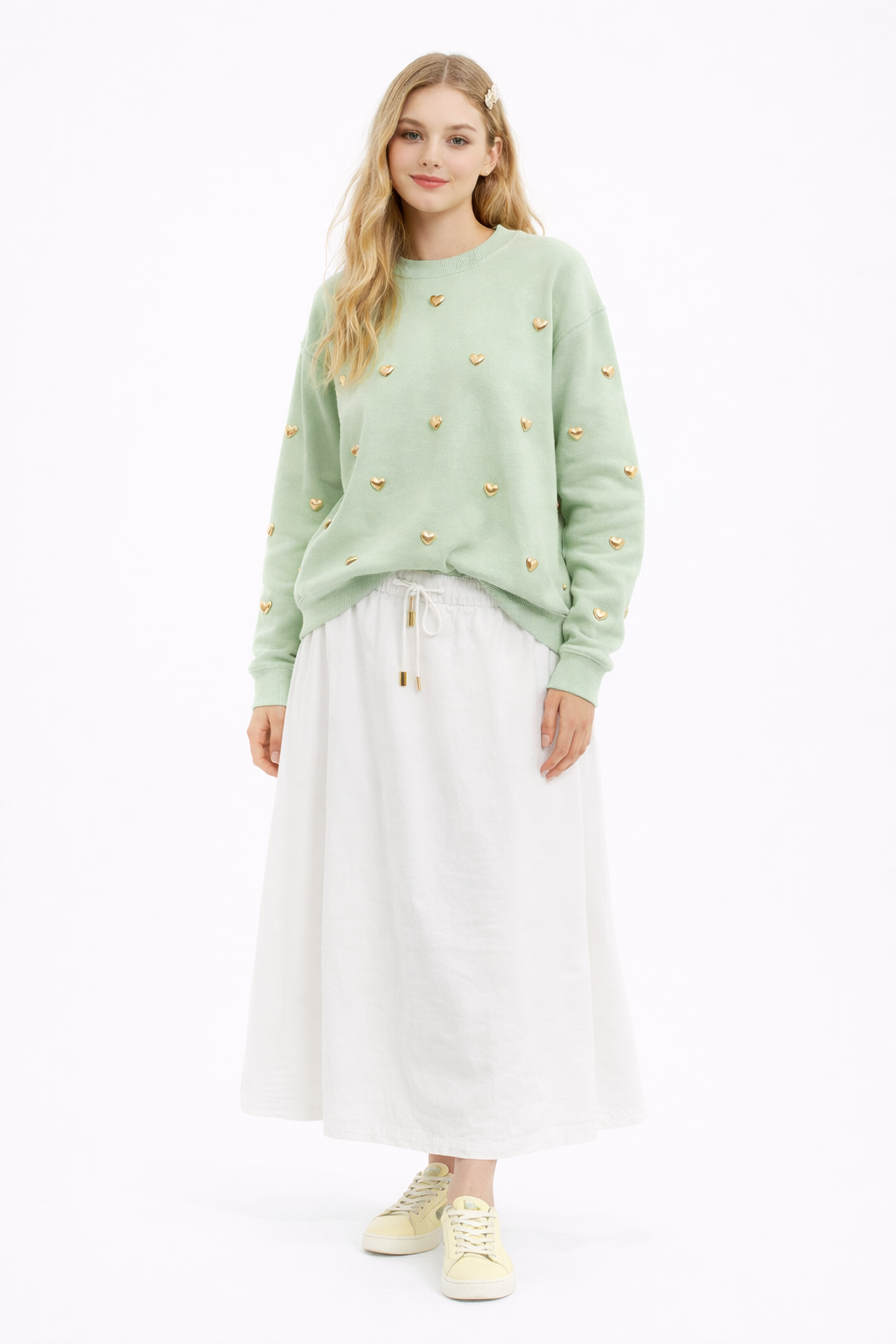 Preciosa sudadera en 65% algodón con corazones tipo tachas en dorado. Los corazones van remachados. Calidad premium.